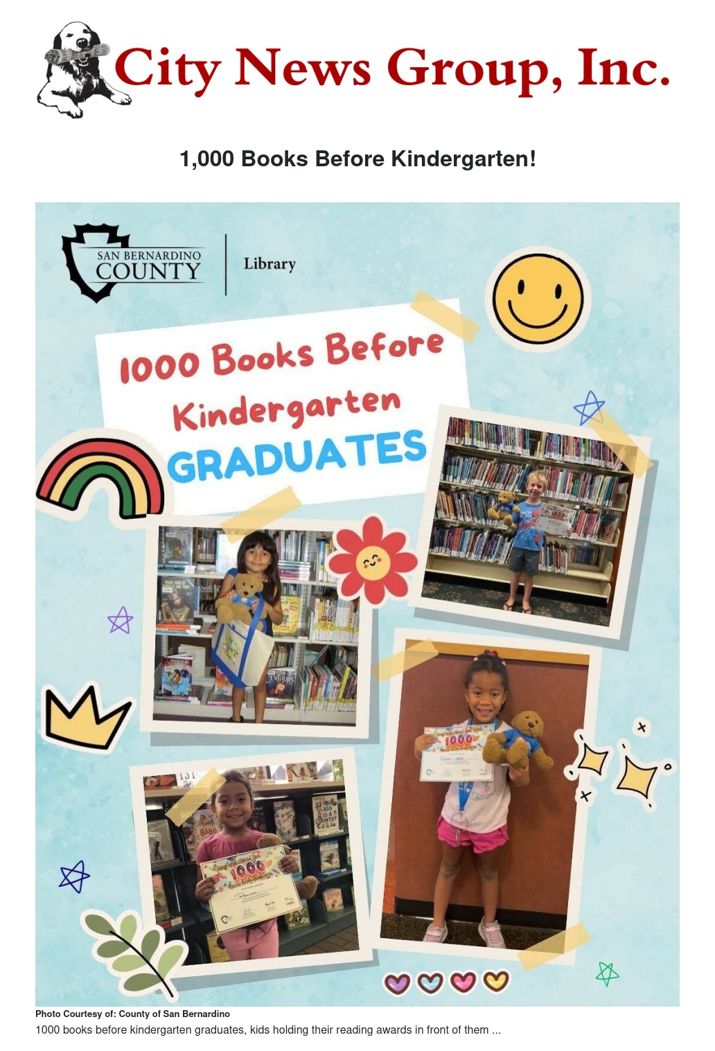 Families interested in enrolling their children in the 1,000 Books Before Kindergarten program can sign up online. For more information about the San Bernardino County Library system, visit library.sbcounty.gov, call 909-387-2220 or follow us on Facebook or Instagram.