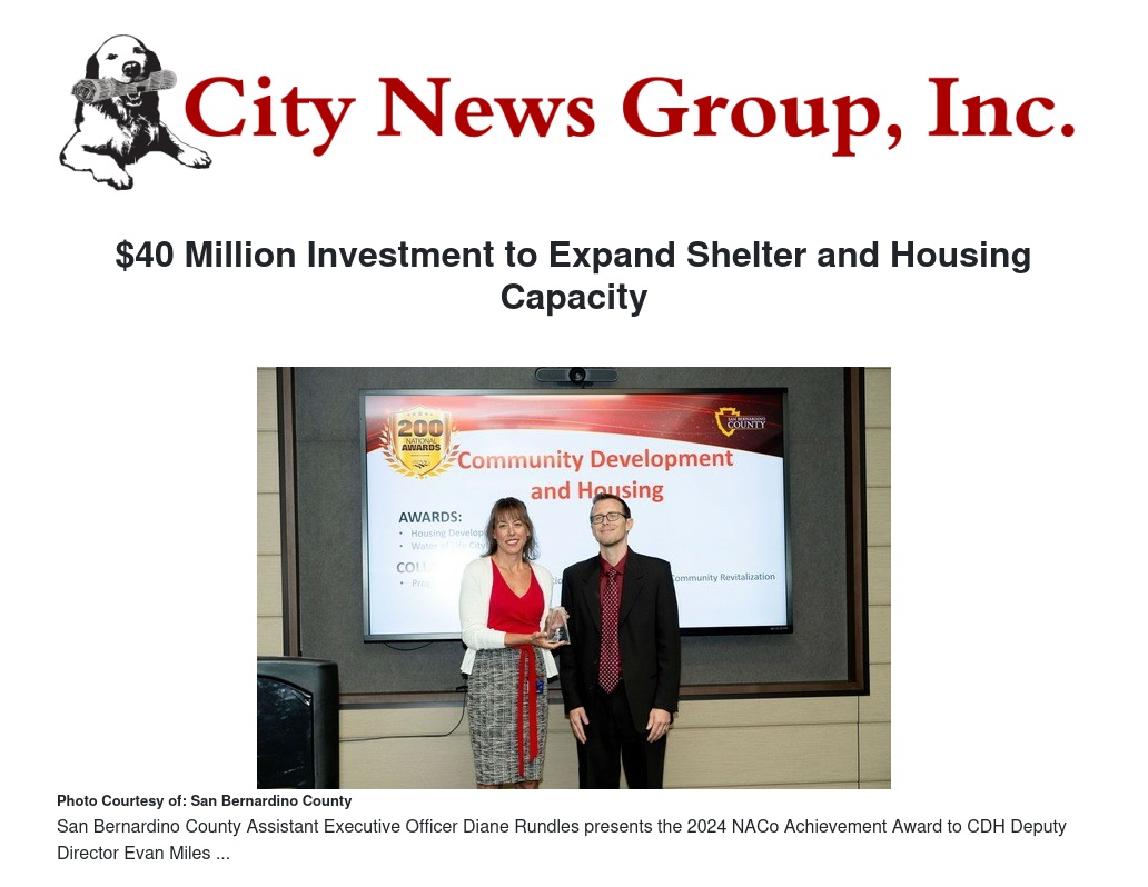 Every year, NACo’s Achievement Awards honor outstanding county government programs that enhance services for residents. This year, NACo recognized the county’s innovative approach to combatting homelessness by establishing a $40 million grant program offered to external entities, primarily cities and community and faith-based organizations, to develop new units to increase the county’s sheltering and housing capacity. The funding was made possible by the support of the San Bernardino County Board of Supervisors.