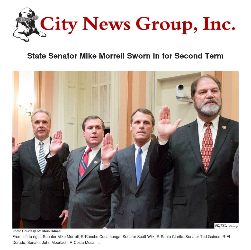 "As I am sworn in, I want to thank voters for placing their confidence in me to continue representing them in Sacramento," Morrell said. "I'm honored to have the opportunity to advocate for the citizens of the 23rd Senate District as we work to make government more effective and efficient and hold it accountable to the people.