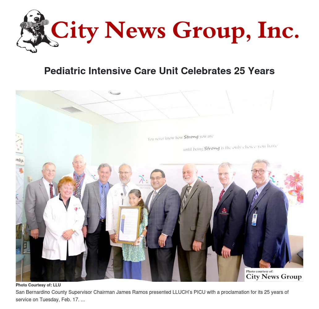 San Bernardino County Supervisor Chairman James Ramos presented Loma Linda University Children’s Hospital (LLUCH) pediatric intensive care unit (PICU) with a proclamation for its 25 years of service to the community on Tuesday, Feb. 17.