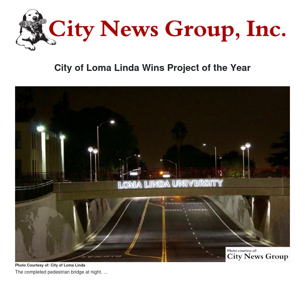 The accomplishment of the pedestrian bridge "not only enhances safety and convenience, but created a major support form Loma Linda University," read the application letter. "Their cooperation and willingness to sacrifice with temporary inconveniences allowed for a timely completion of this project. Throughout the project timeline, pedestrian, vehicular and business access was maintained."