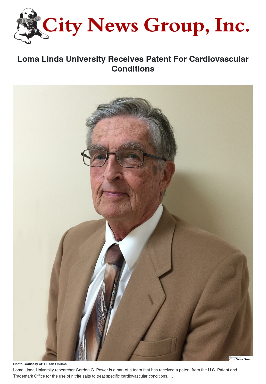 LOMA LINDA>> Loma Linda University researcher Gordon G. Power, together with a team of researchers from several other universities, has received a patent from the U.S. Patent and Trademark Office for the use of nitrite salts to treat specific cardiovascular conditions.