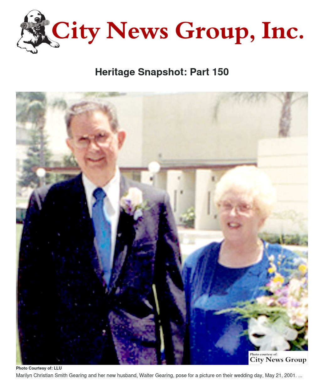 Soon after becoming Dean, Marilyn Christian started advanced studies for her doctoral degree at the University of Southern California (EdD, 1974). Marilyn Christian married Maurice Eugene Smith on Valentine's Day, Feb. 10, 1980. The secret wedding was held at the Redlands home of Marguerite and Louis L. Smith, MD (a vascular surgeon at LLUMC and Mory’s brother). On May 21, 2001, three years after Mory's death from end-stage renal disease, Marilyn married Walter Laverne Gearing, a widower-neighbor. Her brother Ed conducted her second marriage in the Campus Chapel.