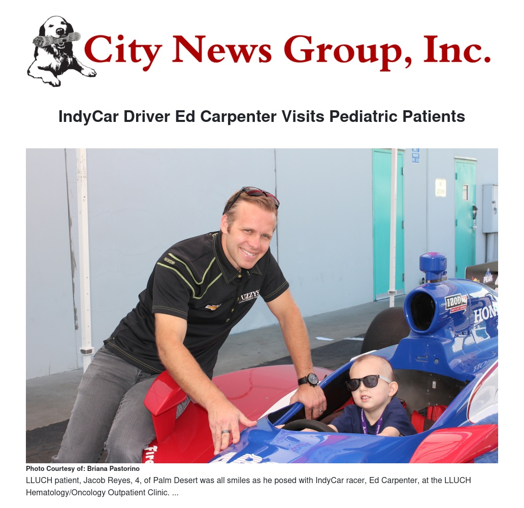 Verizon IndyCar driver Ed Carpenter paid a visit to the LLUCH Hematology/Oncology Outpatient Clinic on Thursday, Aug. 28. The seasoned driver visited with kids signing photos and Racing for Kids hats for them as they received treatment in the infusion center.