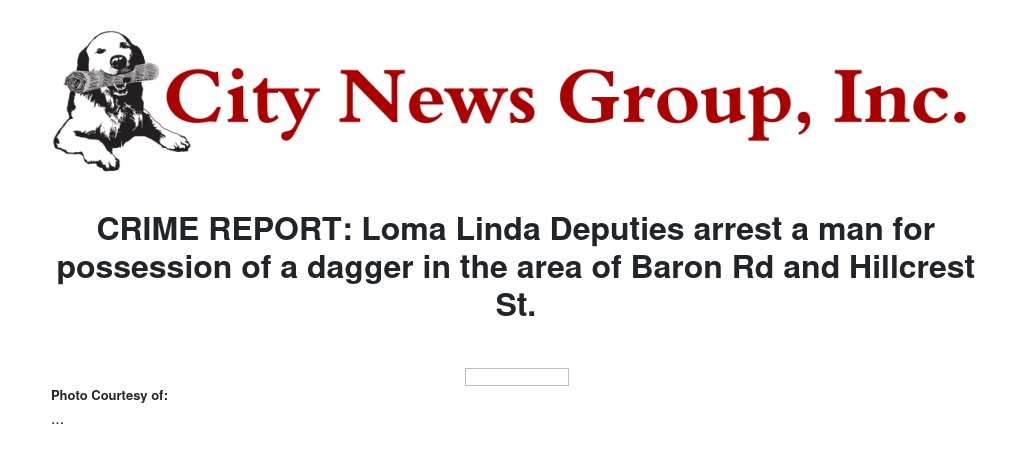 CRIME REPORT: Loma Linda Deputies arrest a man for possession of a dagger in the area of Baron Rd and Hillcrest St.