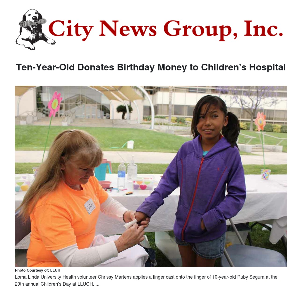 Recently, Ruby Segura and her mother drove to Loma Linda University Children’s Hospital (LLUCH) from their Cathedral City home. They did not go for any sort of treatment or to visit a patient, but because 10-year-old Ruby wanted to donate her birthday money to the kids at the hospital.