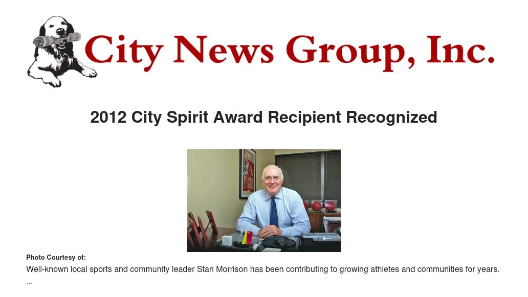 Jim Stream, Executive Director of the Arc of Riverside County, said, “Whenever Morrison takes on a cause or a project, he is ‘all in’ and those around him get energized and excited and suddenly the seemingly impossible becomes possible. He has that effect on those who have the pleasure of working with him. There cannot be a more deserving Riverside citizen of the 2012 City Spirit Award.”