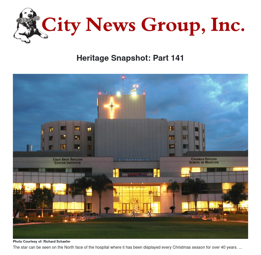“Prop wash” from emergency helicopter landings beat it up a little, so they strengthened it with aluminum bracing, and it’s been displayed every Christmas season for more than 40 years. It is stored between Christmas seasons under the nearby heliport. During this commercial time of year, I hope it takes observers back to the Star of Bethlehem and the real reason for the season.
