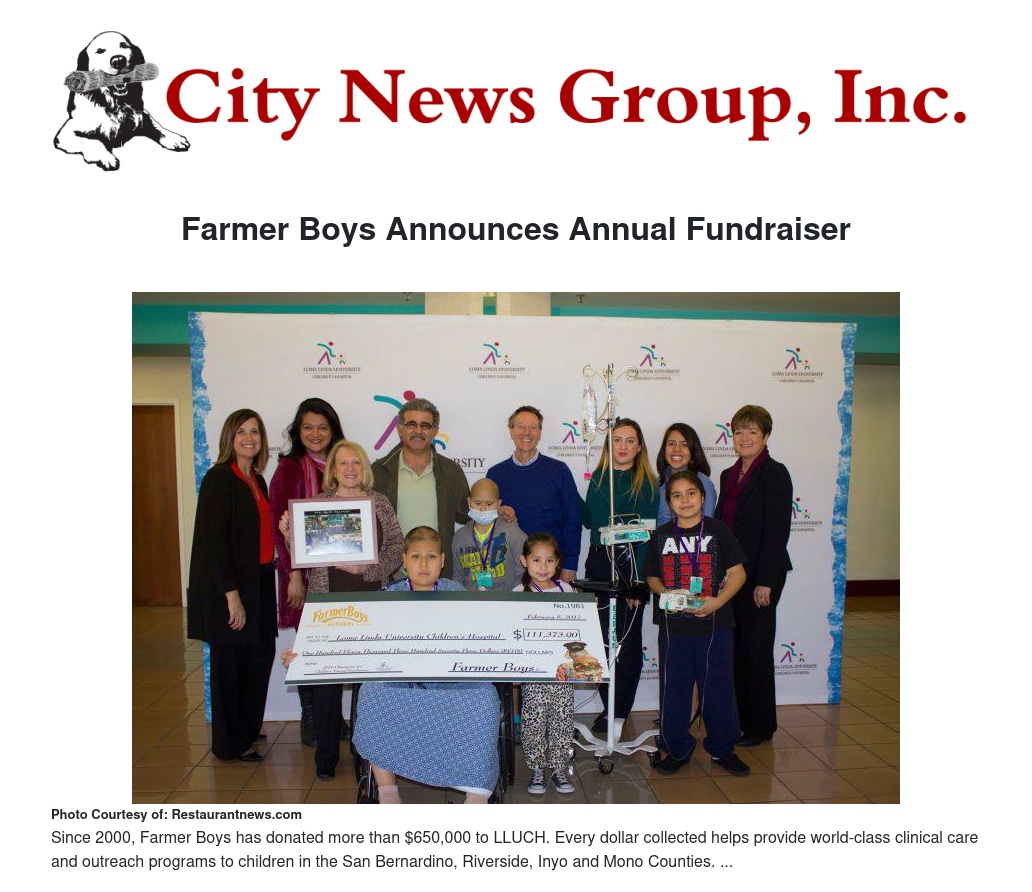 Since 2000, Farmer Boys has donated more than $650,000 to LLUCH. Every dollar collected helps provide world-class clinical care and outreach programs to children in the San Bernardino, Riverside, Inyo and Mono Counties. Donations also fund research leading to innovation in youth health and wellness delivering on the promise of a healthier future today for children in the region and beyond.