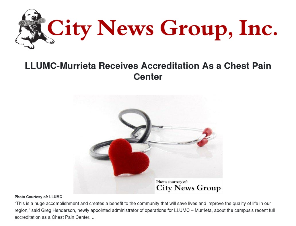 LLUMC-Murrieta Receives Accreditation As a Chest Pain Center