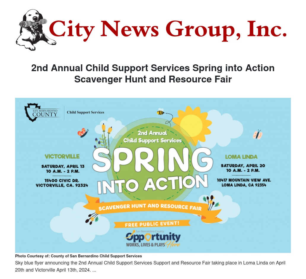 The Department of Child Support Services is excited to announce the 2nd Annual Spring into Action Scavenger Hunt and Resource Fair. The Spring into Action event aims to unite over twenty agencies, providing resources for San Bernardino County’s families and communities. Child Support professionals will be onsite to help San Bernardino County residents open a new child support case, negotiate a license release and answer any case specific questions. Children will have the opportunity to participate in a scavenger hunt and win prizes.