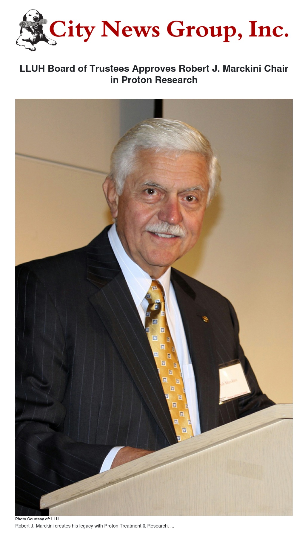“In more recent years, they have turned their energies to raising endowments to enhance the research efforts at Loma Linda and keep the James L. Slater, MD Proton Treatment & Research Center at the cutting edge of this popular treatment for both cancer and other diseases,” Dr. Hart concluded. “Bob's legacy will now be memorialized in the Robert J. Marckini Chair.”