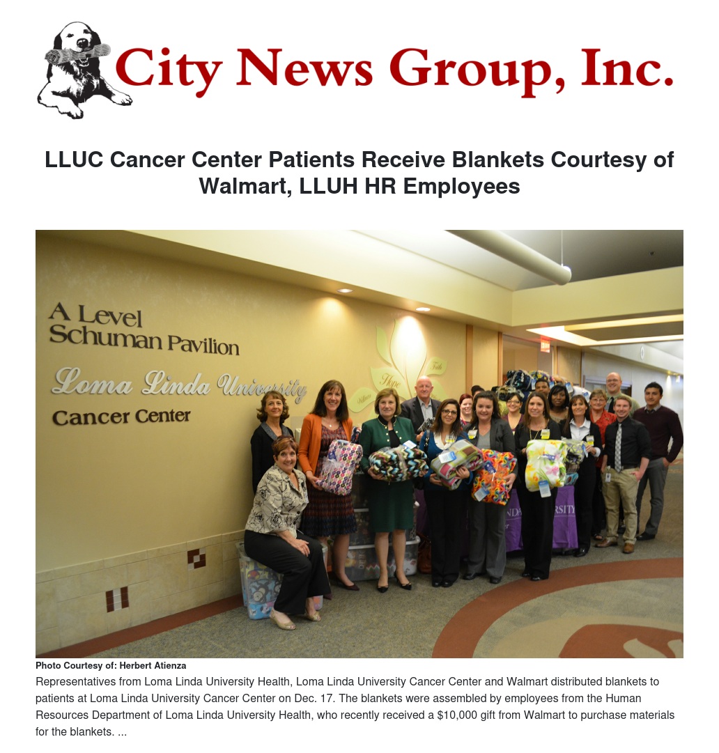 Patients at Loma Linda University (LLU) Cancer Center will enjoy added warmth this year after receiving gifts of blankets, thanks to a joint initiative of Walmart and employees of the Human Resources Department at Loma Linda University Health.