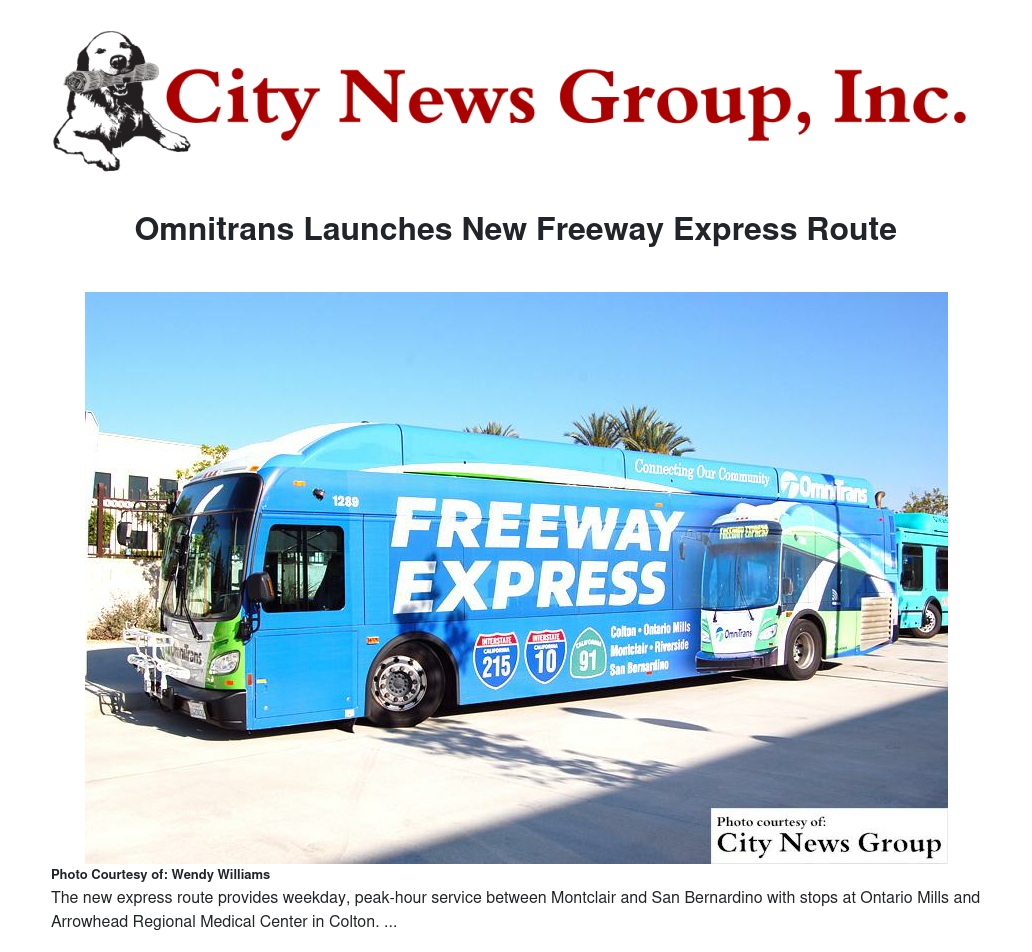 The new express route provides weekday, peak-hour service between Montclair and San Bernardino with stops at Ontario Mills and Arrowhead Regional Medical Center in Colton.