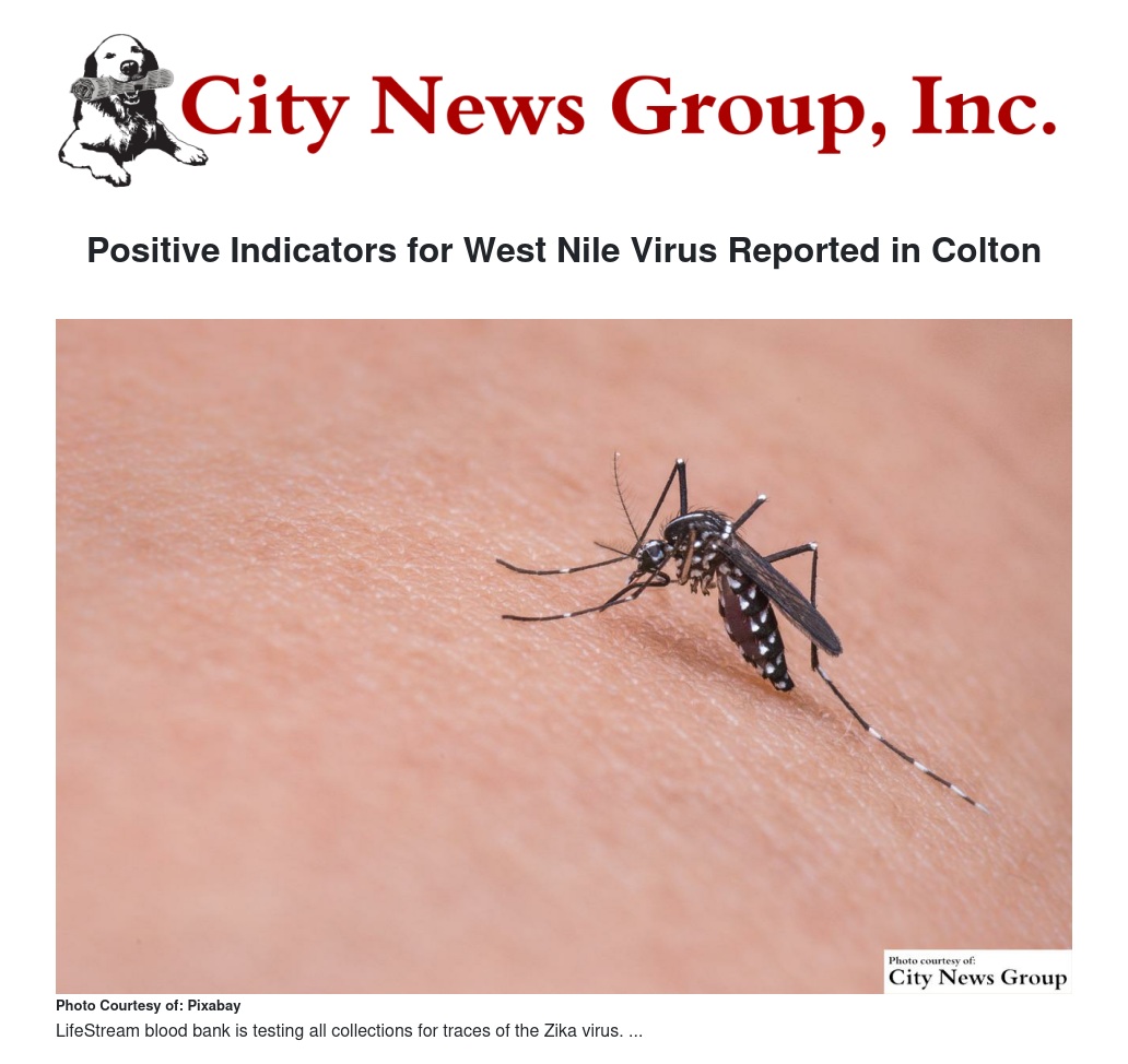 COLTON >> The Division of Environmental Health Services' Mosquito and Vector Control Program has reported multiple positive indicators for West Nile Virus in San Bernardino County.