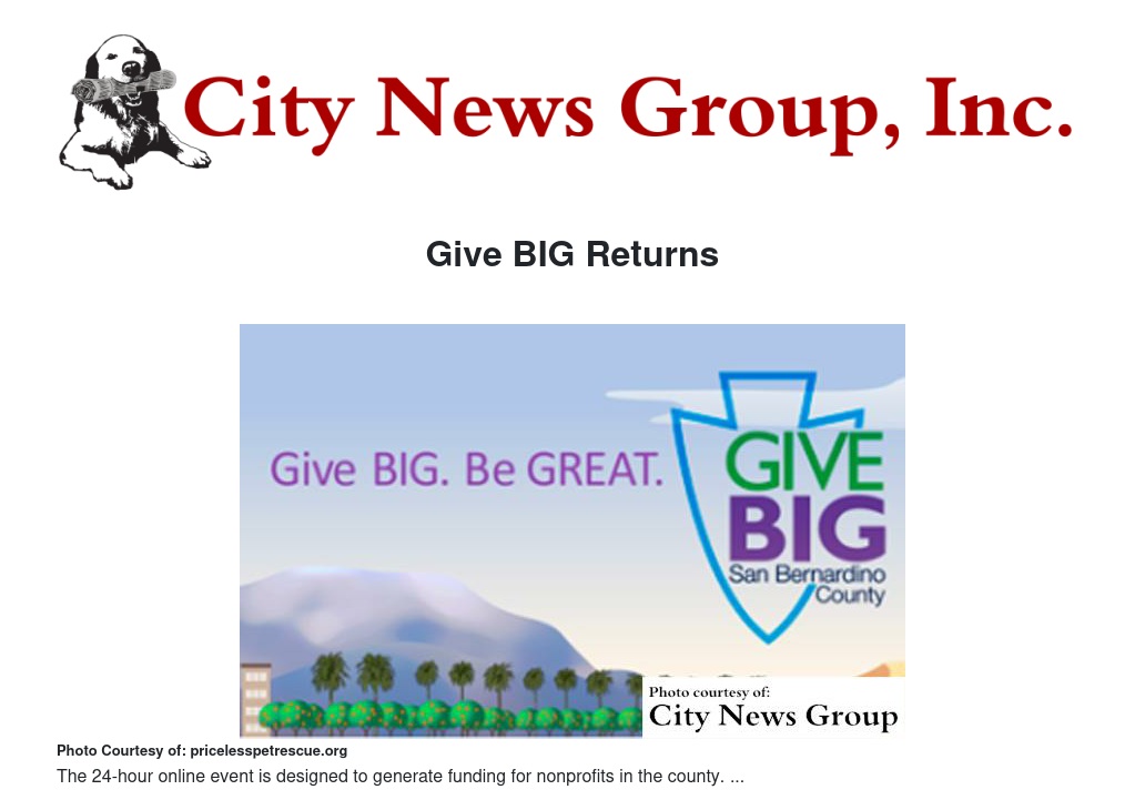 SAN BERNARDINO >> The Community Foundation is pleased to announce the return of Give BIG San Bernardino County, an exciting 24-hour event to increase philanthropy in San Bernardino County through online giving. Give BIG San Bernardino County will take place on Tuesday, November 29 from midnight through Dec. 1.