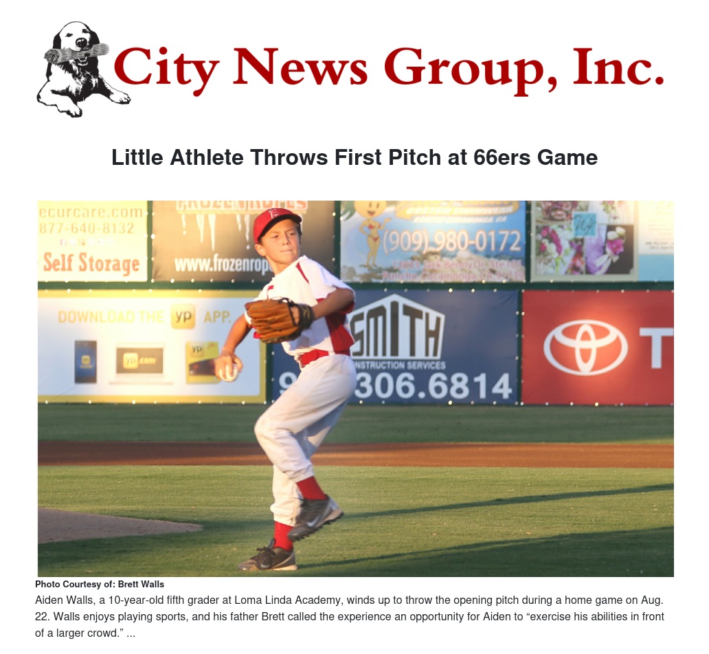 When 10-year-old Aidan Walls stepped up to the pitcher’s mound at San Manuel stadium to throw the ceremonial opening pitch during an Inland Empire 66ers home game on Aug. 22, he appeared a little nervous. Once the crowd clapped and cheered him on, his successful pitch to a 66ers catcher brought a huge smile to his face and his nerves disappeared.
