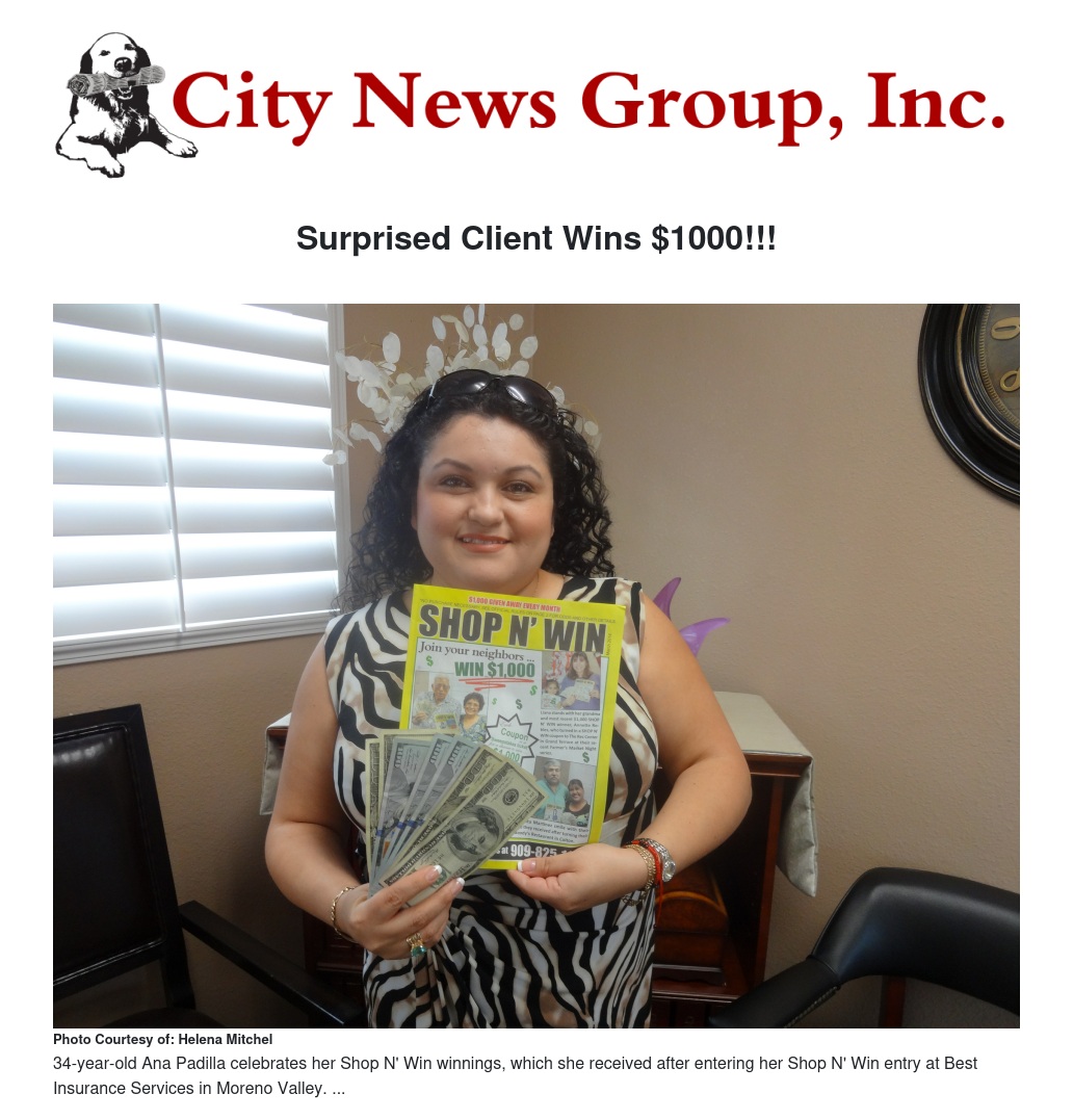 34-year-old Ana Padilla didn't think much of it, when at a routine visit to Best Insurance Services (BIS) in Moreno Valley, she was asked to fill out a coupon for a chance to win $1,000, little did she know less than a month later she would be the winner.