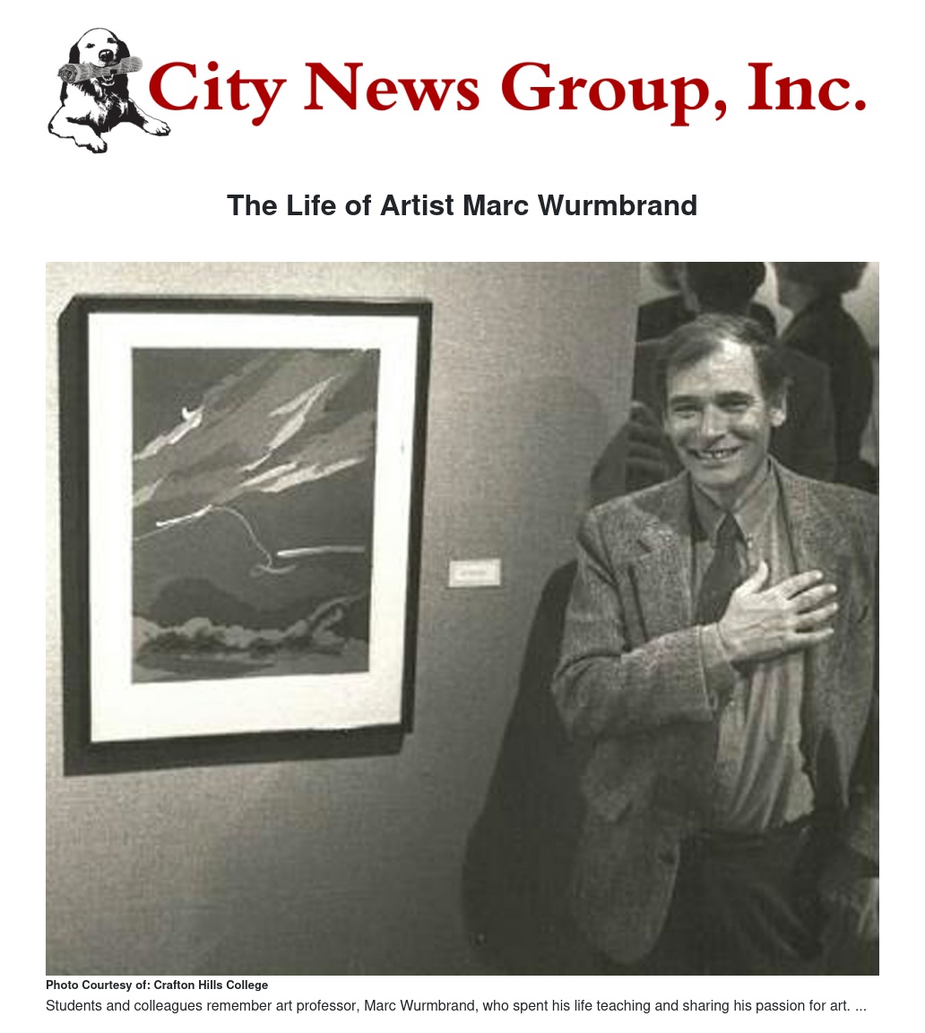 Wurmbrand later taught at San Bernardino Valley College, leaving to found the art department at Crafton Hills College. During his 35-year tenure there, he would receive honors for Teacher of the Year, warmly offering his talent to generations of students.