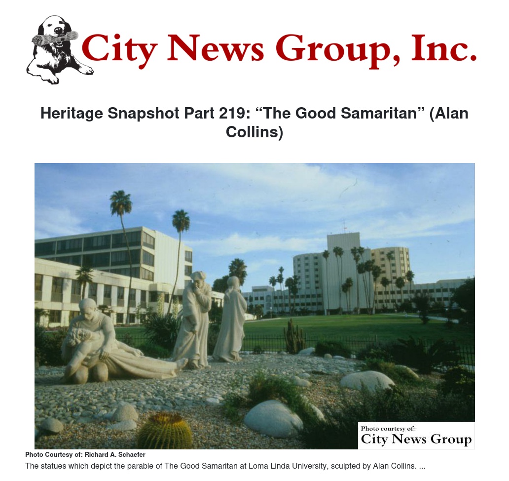 LOMA LINDA >> The idea of a significant sculpture for Loma Linda University originated with Gaines R. Partridge, EdD, Dean of Student Affairs. On October 20, 1974, he presented a maquette (a small model) of a sculpture created by Alan R. Collins, DFA, FRBS. It depicted the parable of the Good Samaritan. He explained if the Board approved, funds for a large artwork would be available. It would be sculpted from white Indiana limestone. Later, it would be cast in bronze for a more permanent display. Partridge proposed a site between the Medical Center and the Administration Building.