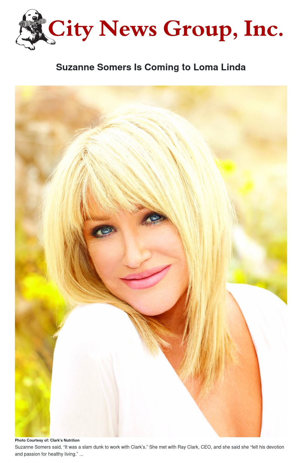 Suzanne Somers will be at Clark’s Nutrition in Loma Linda on Sunday, Nov. 3 at 11 a.m.