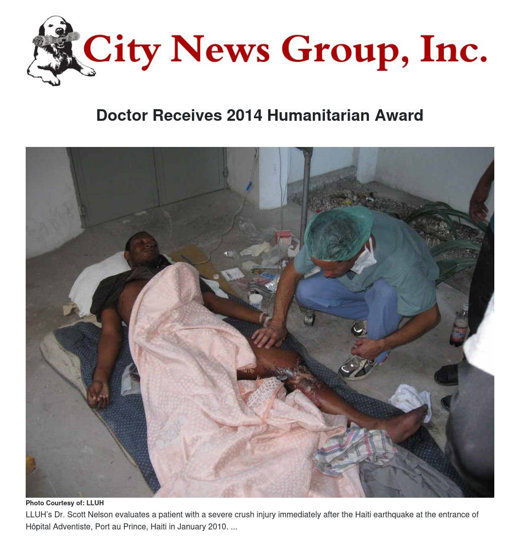 Scott C. Nelson, MD, was recently honored by the American Academy of Orthopaedic Surgeons with the 2014 Humanitarian Award for having distinguished himself through outstanding musculoskeletal-related humanitarian activities. At age 43, Nelson is the youngest recipient of this award.