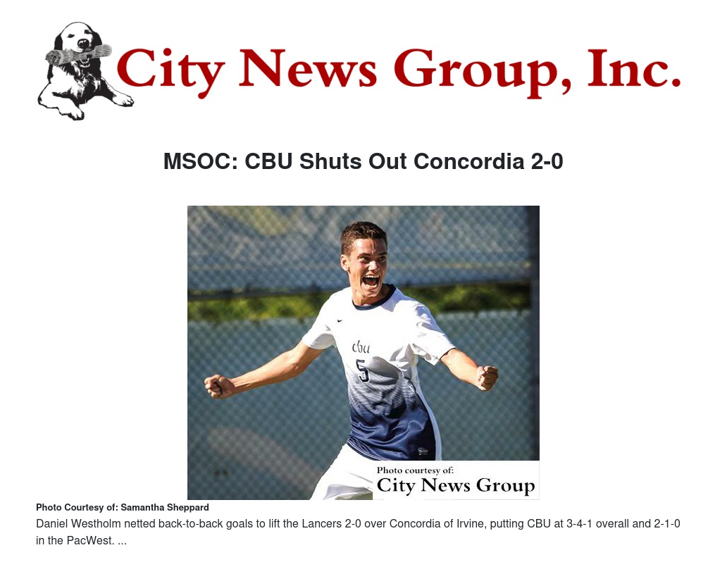 Daniel Westholm netted back-to-back goals to lift the Lancers 2-0 over Concordia of Irvine, putting CBU at 3-4-1 overall and 2-1-0 in the PacWest. The Eagles drop to 2-5-0 on the year, 2-1 in conference.