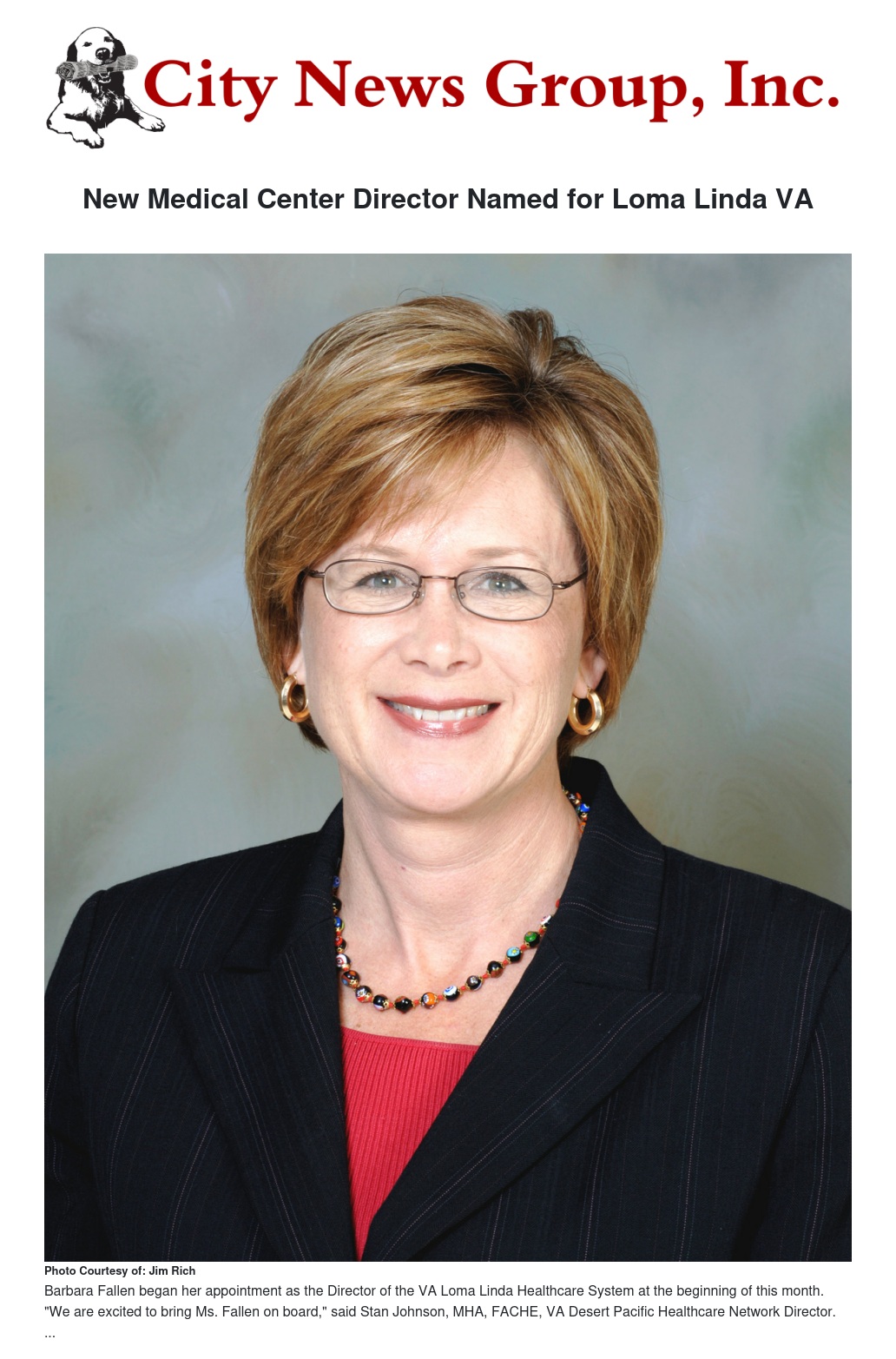 The Department of Veterans Affairs is pleased to announce Monday, July 1, the appointment of Barbara Fallen, FACHE, as the new Director of the VA Loma Linda Healthcare System. Fallen will oversee delivery of health care to more than 65,000 Veterans and an operating budget of $463 million.