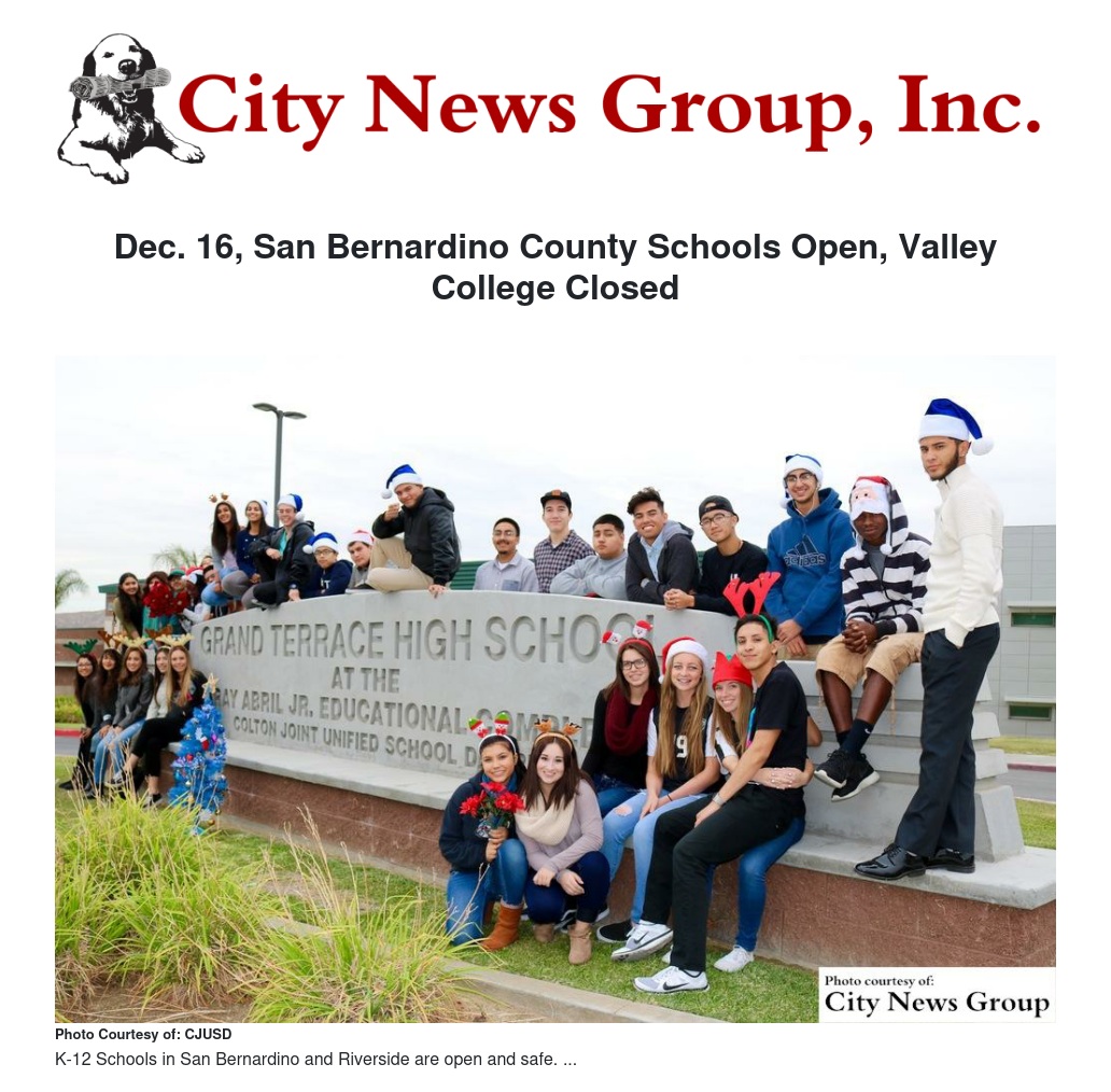 Dec. 16, San Bernardino County Schools Open, Valley College Closed