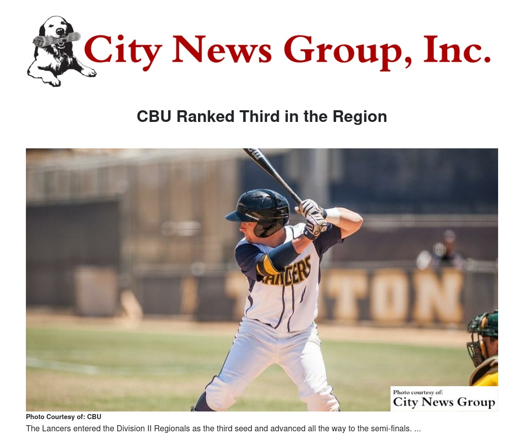 CBU will face fifth-ranked Cal Poly Pomona during the regular season. The Broncos will get the Lancers in Pomona for three games beginning on Feb. 26th at 2 p.m. and the series finale doubleheader is also being played in Pomona Feb. 28th at noon.