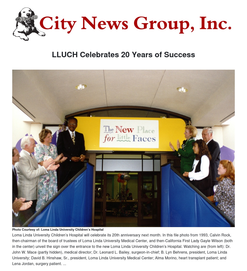 “It’s hard to believe that it’s been 20 years since our region has been blessed by the opening of Loma Linda University Children’s Hospital,” LLUCH Administrator Zareh Sarrafian said.