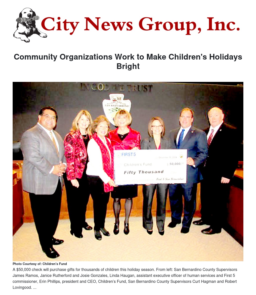 Children's Fund received a $50,000 grant from First 5 San Bernardino during a check presentation made Dec. 17 at the San Bernardino County Board of Supervisors meeting, allowing the nonprofit to purchase and distribute holiday gifts for economically disadvantaged children in the area.