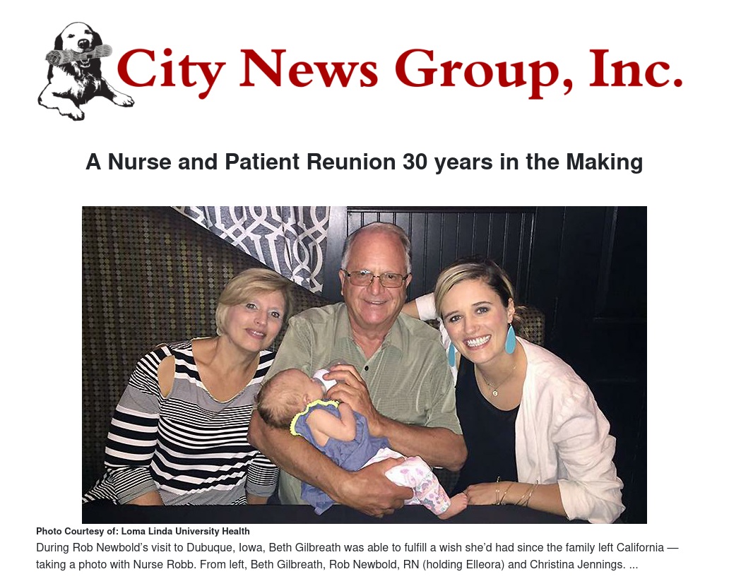 Jennings, 31, a revenue analyst at the University of Iowa, was a baby when Rob Newbold took care of her at Loma Linda University Medical Center’s pediatric intensive care unit (PICU). She and her mother relocated from Rancho Cucamonga, California, to Dubuque, Iowa in 1992.