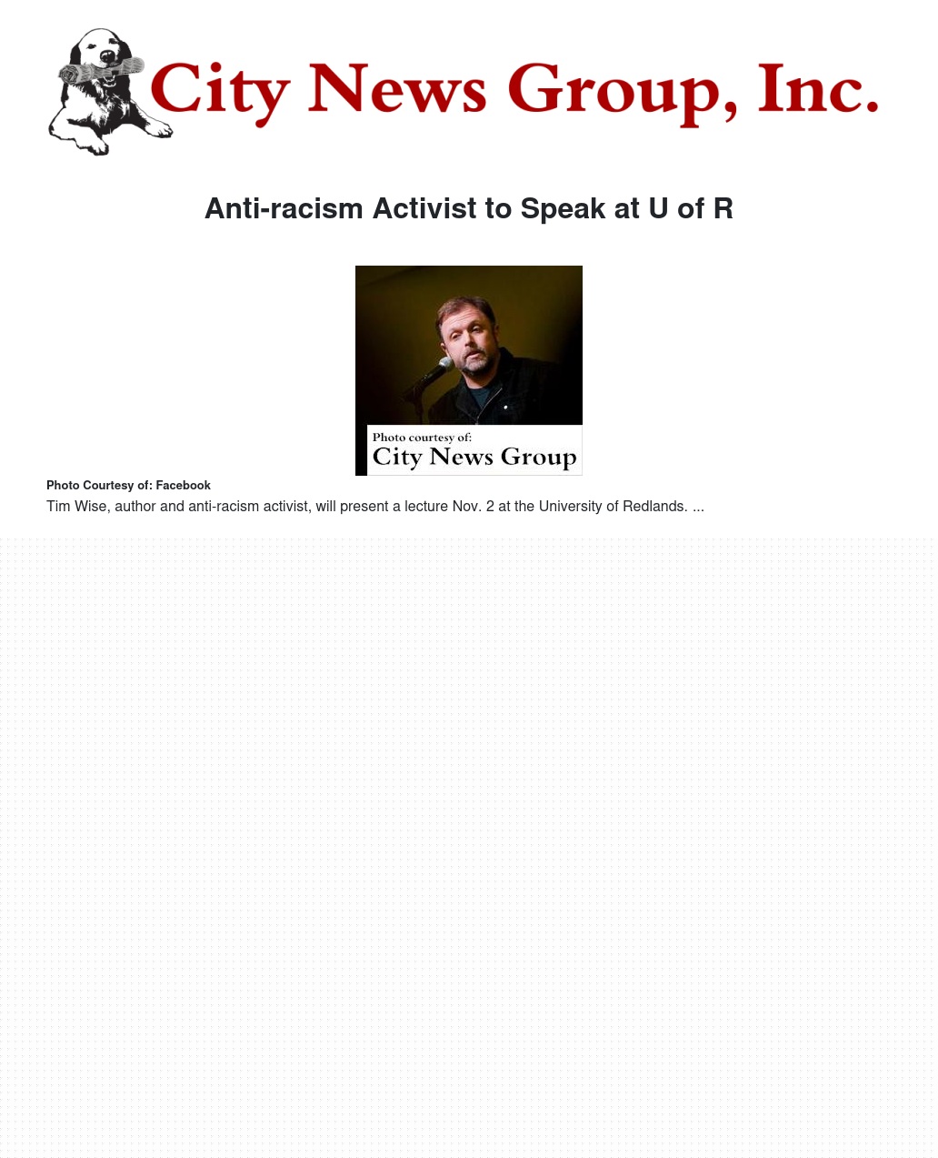 REDLANDS>> Prominent anti-racism activist Tim Wise will present a talk based on his book, "Culture of Cruelty: How America's Elite Demonize the Poor, Valorize the Rich and Jeopardize the Future" at the University of Redlands on Nov. 2 at 7 p.m. in the Memorial Chapel.