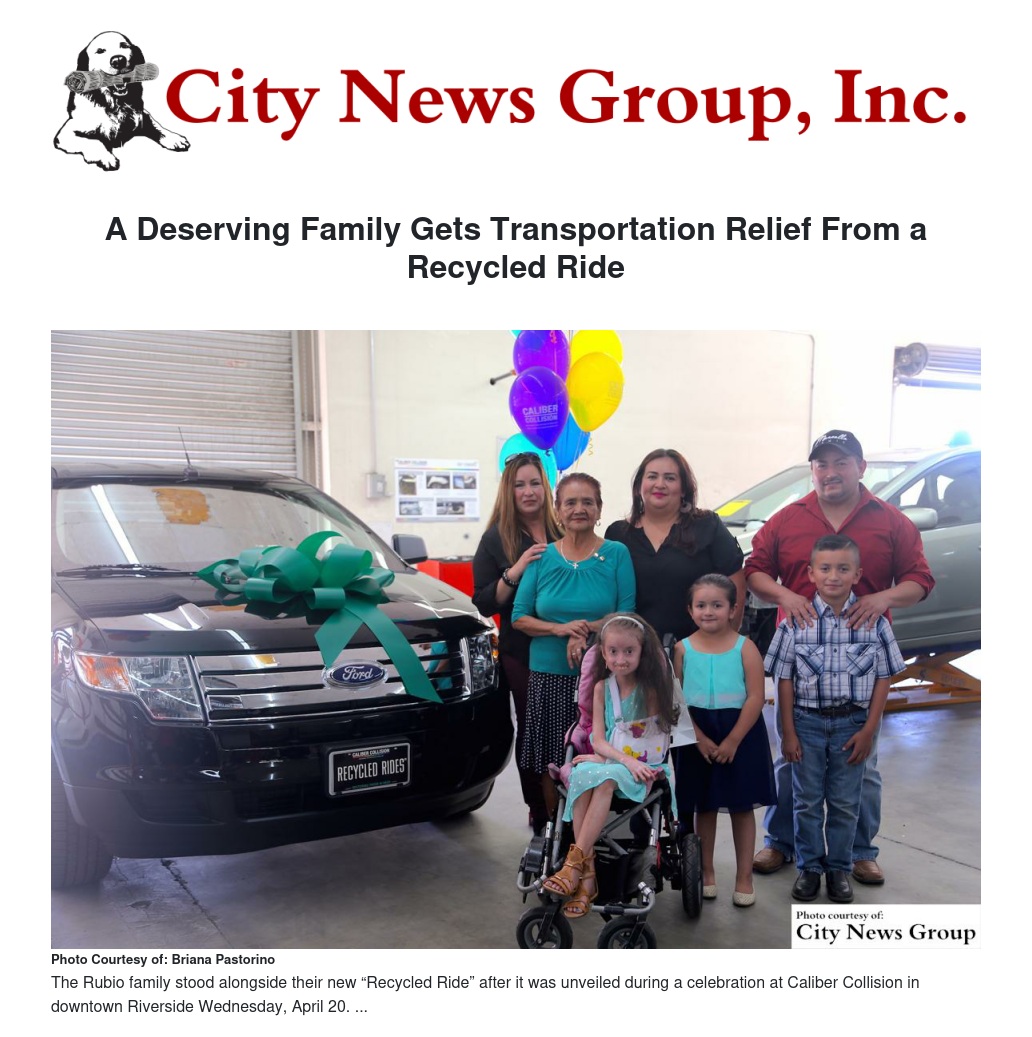 RIVERSIDE >> Loma Linda University Children’s Hospital (LLUCH) patient Sofia Rubio was smiling ear-to-ear as a shiny black Ford Edge, accented with a giant green bow, rolled into downtown Riverside’s Caliber Collision. The “Recycled Ride” was a gift to Sofia and her family from Caliber Collision-Riverside Downtown and Geico Insurance through the National Auto Body Council’s Recycled Rides™ program. The car was presented to the Rubio family during a celebration Wednesday, April 20.