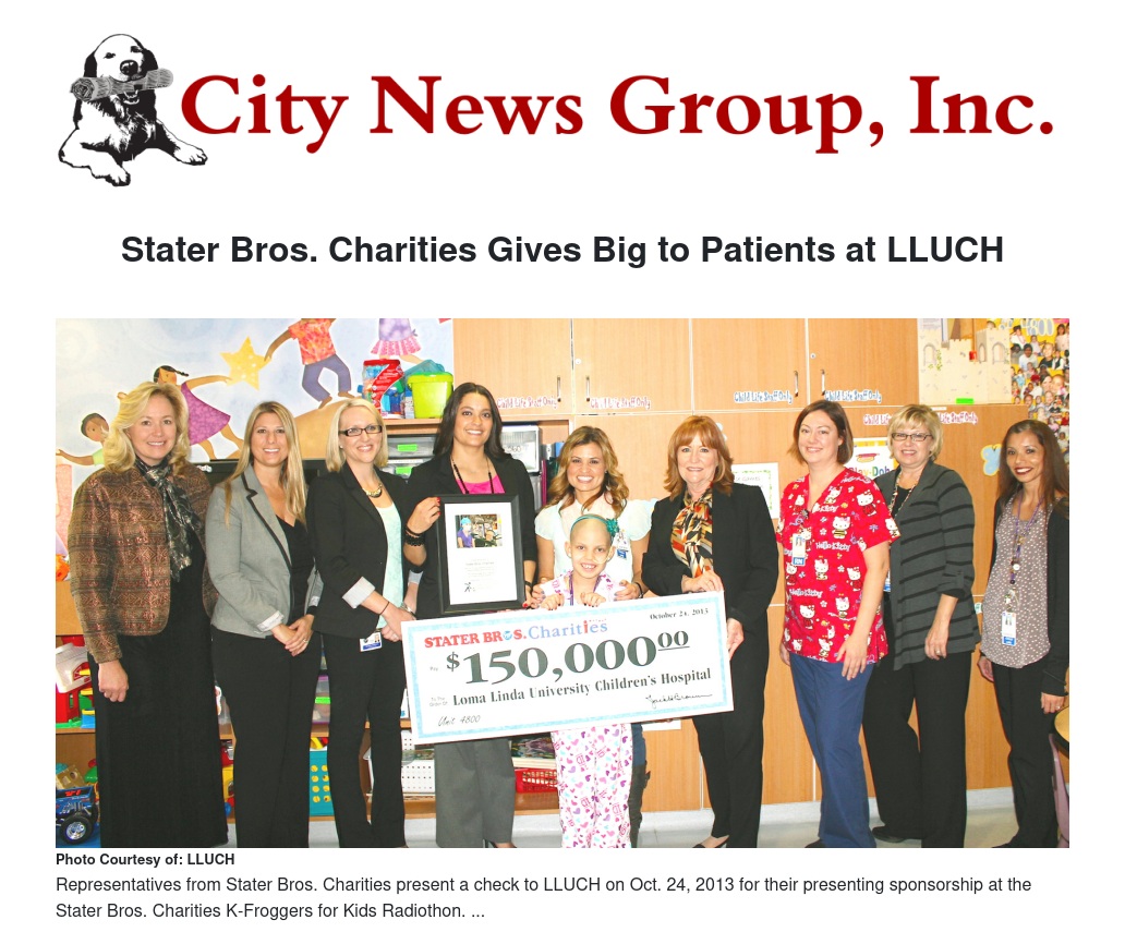 Stater Bros. Charities presented Loma Linda University Children’s Hospital (LLUCH) with a check for $150,000 on Thursday, Oct. 24.