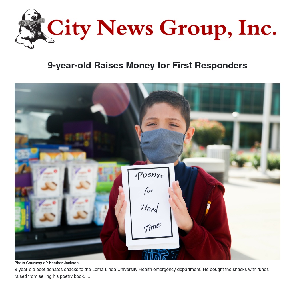 Rushing raised more than $400 since May 1 by selling his book of poetry called “Poems for Hard Times.” He said he wanted to donate to Emergency Department workers at Loma Linda University Medical Center because his pediatrician works at Loma Linda University Health.