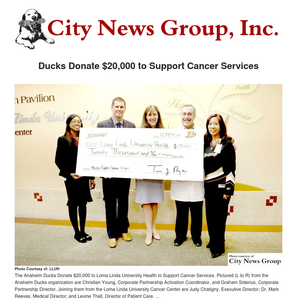 “Virtually everyone has been touched by cancer or knows someone who has been affected by it,” said Graham Siderius, corporate partnership director for the Anaheim Ducks. “We know about the outstanding clinical and support services delivered by the Loma Linda University Cancer Center. The center has challenging work, and it is an indispensable resource for stricken patients. The Ducks and its fans are pleased to do our part to assist the effort.”