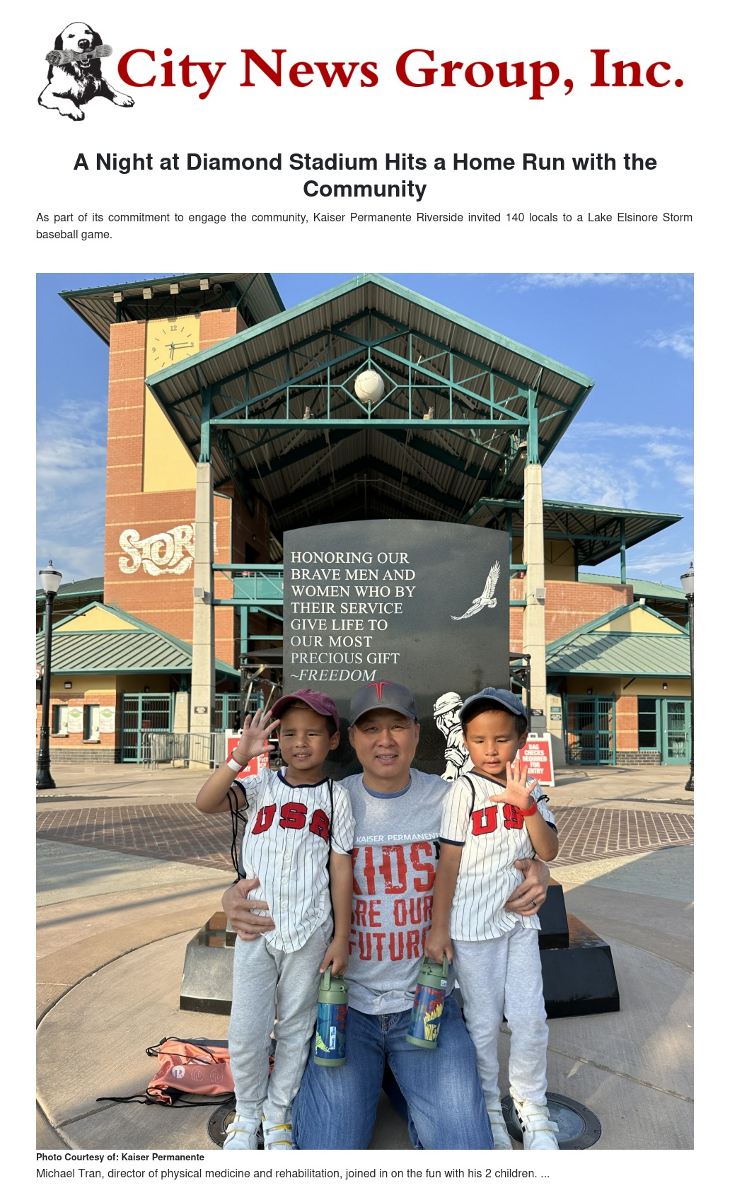 “At Kaiser Permanente, we believe that good health starts at home and that family activities and community connections are an important part of a healthy life. That’s why we’re excited to be one of the newest sponsors of the Lake Elsinore Storm. We’re thrilled to create opportunities to celebrate the kids in our community, who will one day become our future doctors, nurses, health care leaders, and pillars in our community,” said Dr. Neri.