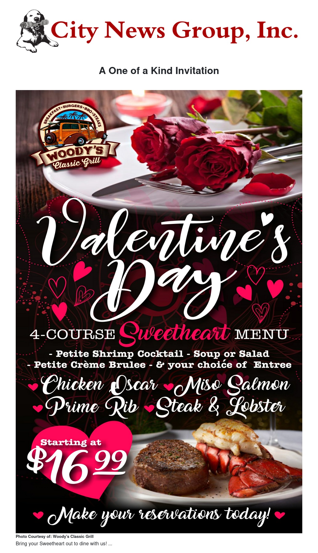 Woody’s Classic Grill, located in the heart of Grand Terrace, is one such restaurant catering to the sweethearts not only on February 14th, but on a daily basis. Mike and Lori Miller, owners of Woody’s would like to invite you to bring your special ones out for a taste of love. Chef Miguel will put his talent on display by serving up a delectable meal especially planned and prepped by him and his talented team of professionals in the kitchen. Food lovers will have their choice of either the classic Woody’s menu or the Valentine’s Day Sweetheart Menu, courteously extended from Thursday, February 14th through Sunday, February 16th.