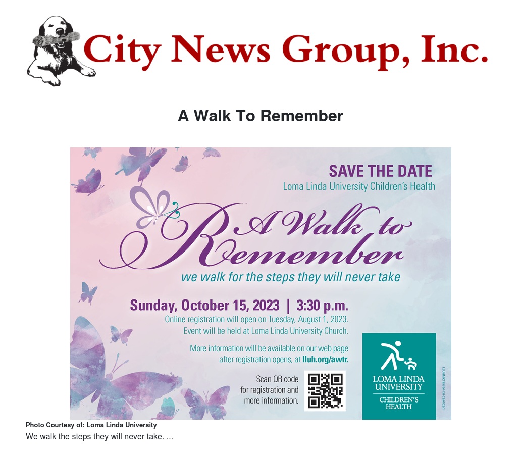 Loma Linda University Children’s Hospital is honored to offer this remembering ceremony to our community, for families who have lost a baby from miscarriage, stillborn or in infancy. We welcome you to join us this year for A Walk to Remember, which will be on Sunday, October 15 @ 3:30 p.m. We look forward to you remembering with us throughout the month of October and forever in our hearts.