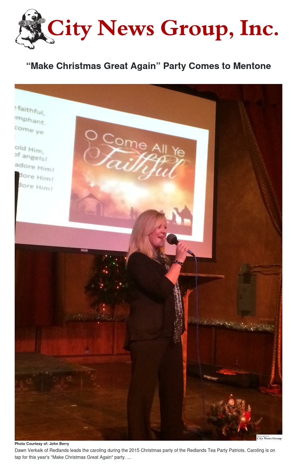 The Dec. 15 Christmas celebration replaces the monthly meeting of the Redlands Tea Party Patriots, whose meetings are customarily held the first Thursday of each month at the Mill Creek Cattle Co., 1874 Mentone Blvd, Mentone.