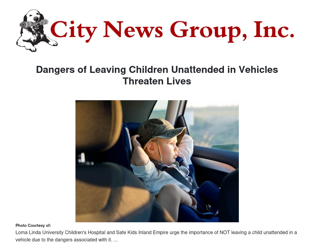 Loma Linda University Children’s Hospital and Safe Kids Inland Empire are urging parents and caregivers to be aware of the dangers of leaving children unattended in a vehicle. As summer approaches and temperatures rise, the threat of heatstroke increases when a child is left in a hot car. Already in 2014, seven kids have died of heatstroke in the United States after being left in or playing in a car while unattended.