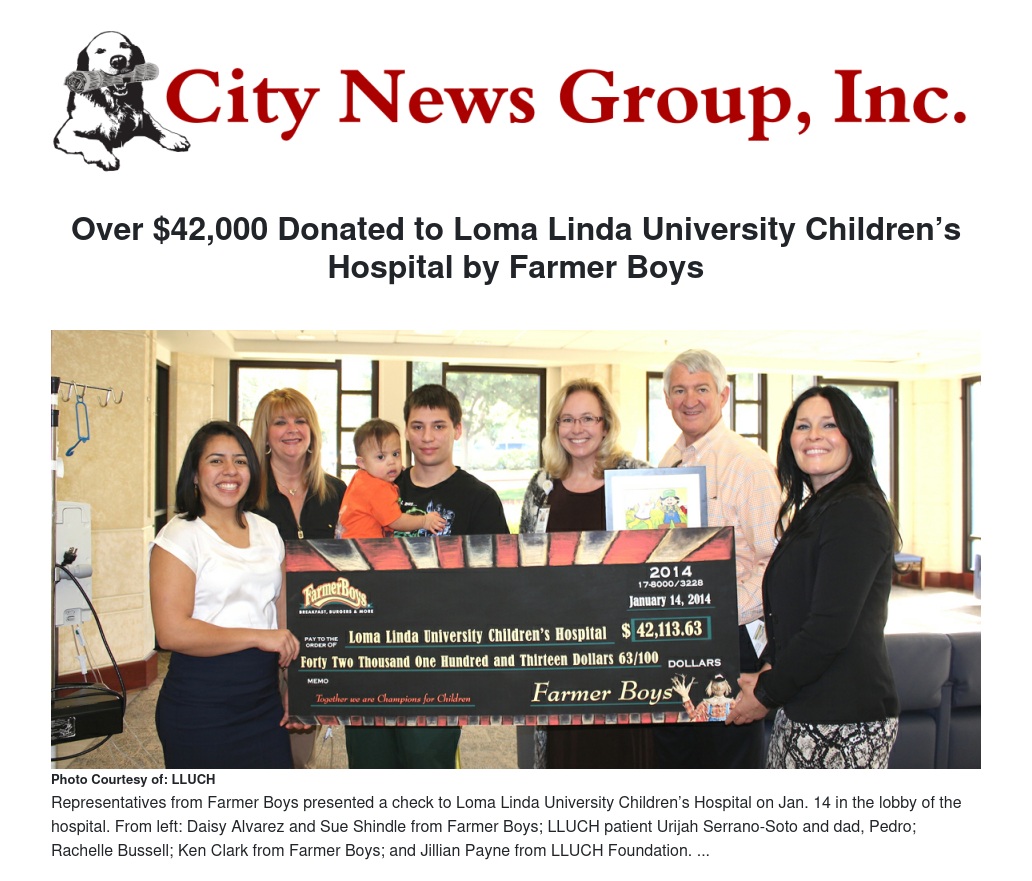 Representatives from Farmer Boys paid a visit to Loma Linda University Children’s Hospital (LLUCH) on Jan. 14, and they did not come empty handed. A check for $42,113.63 was handed over to the hospital.