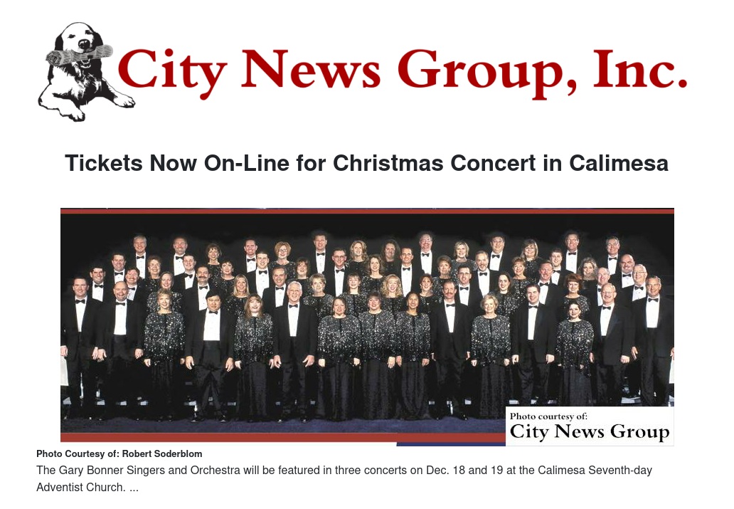 The Gary Bonner Singers and Orchestra will be featured in three concerts on Dec. 18 and 19 at the Calimesa Seventh-day Adventist Church.
