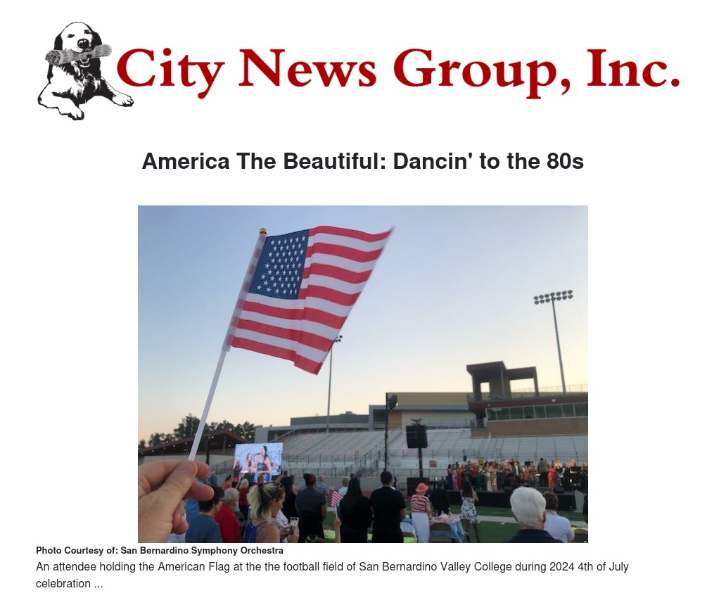 The San Bernardino Symphony Orchestra, under the baton of Maestro Anthony Parnther, will present their annual concert under the stars with fireworks on Saturday, July 5, 2024 at 7:30 p.m. on the football field of San Bernardino Valley College. We hope you can attend, and that you will want to make it possible for local heroes to attend, as well.