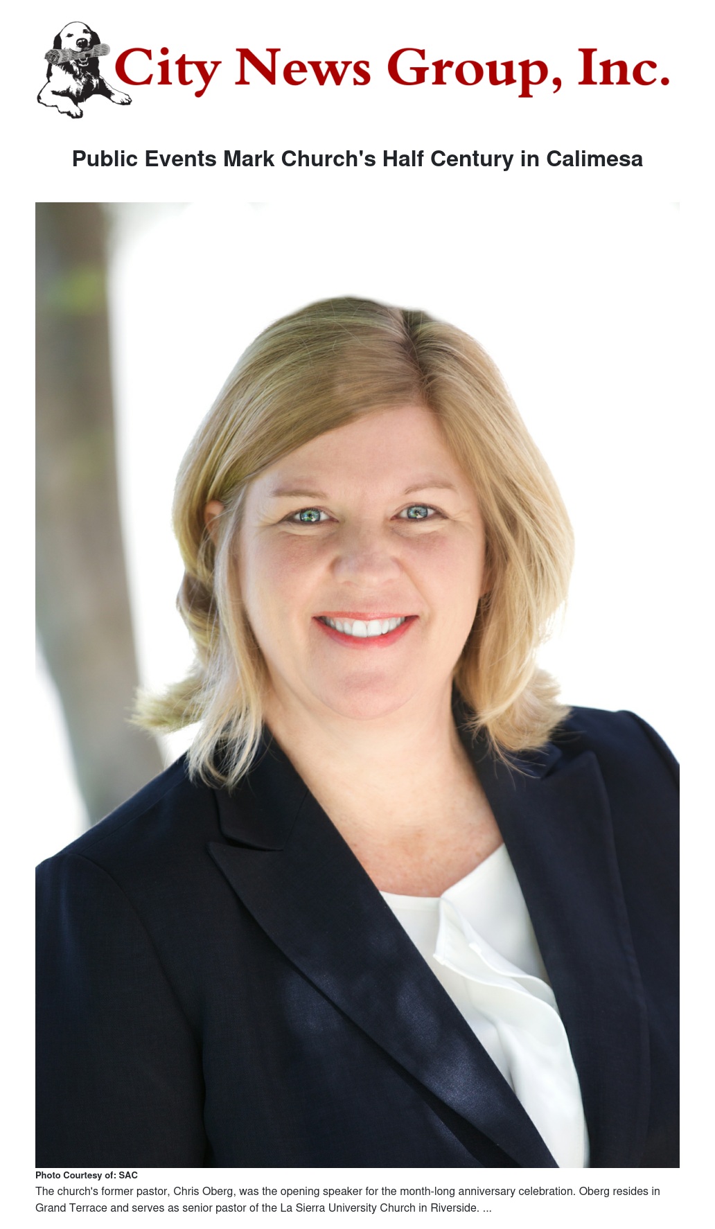 Chris Oberg, now senior pastor at La Sierra University Church in Riverside (at Calimesa 2005-2009), will speak on Aug. 2; Clarence Schilt (at Calimesa 1993-2005) on Aug. 9; Mic Thurber (at Calimesa 1991-1993) on Aug. 16; and Art Earll, now director of adult services at Loma Linda University Behavioral Medicine Center (at Calimesa 1986-1993), on Aug. 23.