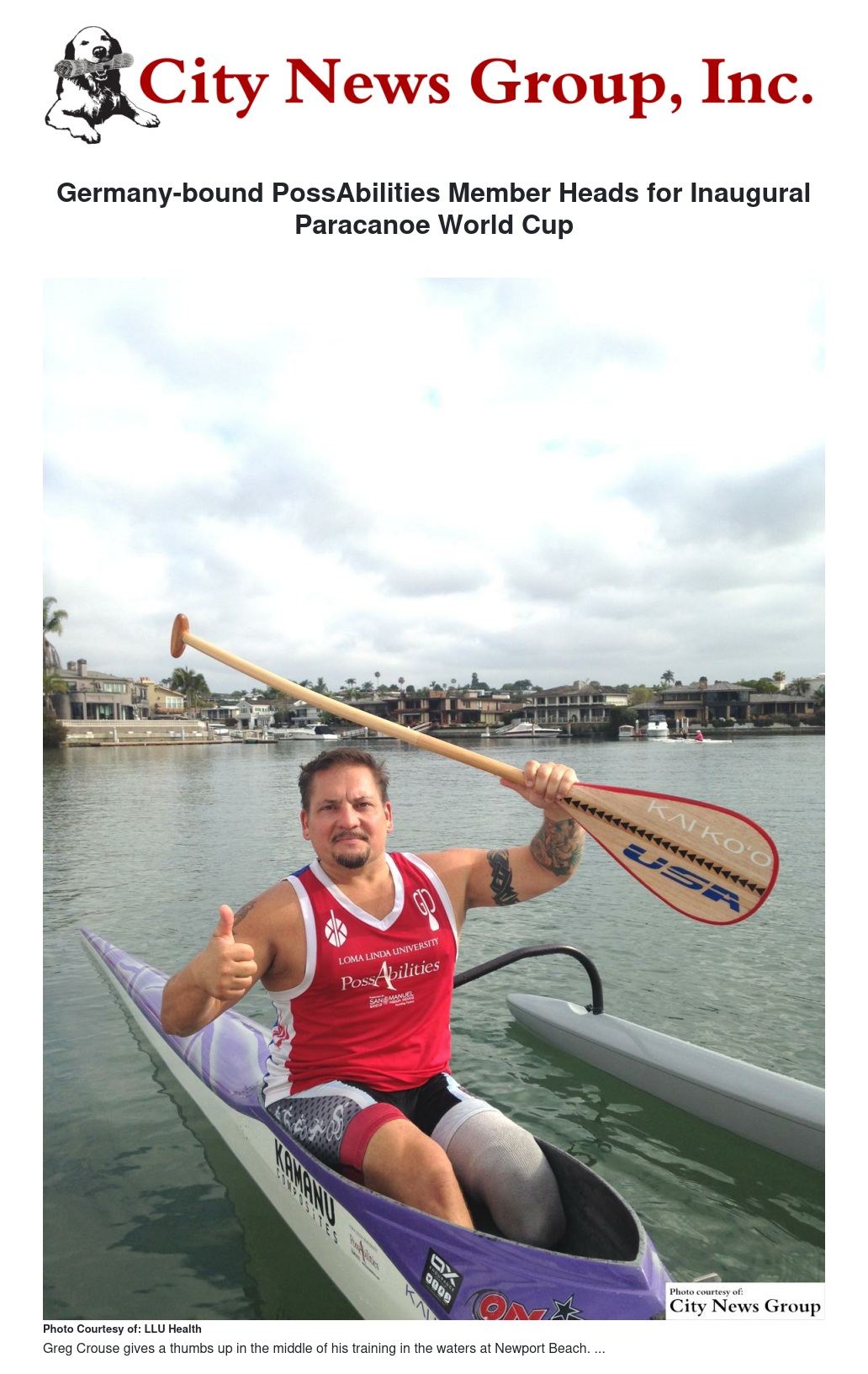 Loma Linda Universtiy Health PossAbilities member Greg Crouse will be headed to Duisburg, Germany for the 2015 inaugural Paracanoe World Cup games May 20-24. Team USA announced via a press release that Crouse was one of four individuals who made it on the World Cup team.