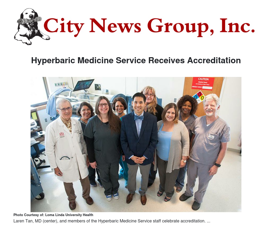 Participation in Undersea and Hyperbaric Medical Society accreditation is voluntary. Laren Tan, MD, medical director for hyperbaric medicine at Loma Linda University Medical Center, said the accreditation demonstrates the organization’s commitment to the highest standards of practice and patient safety.