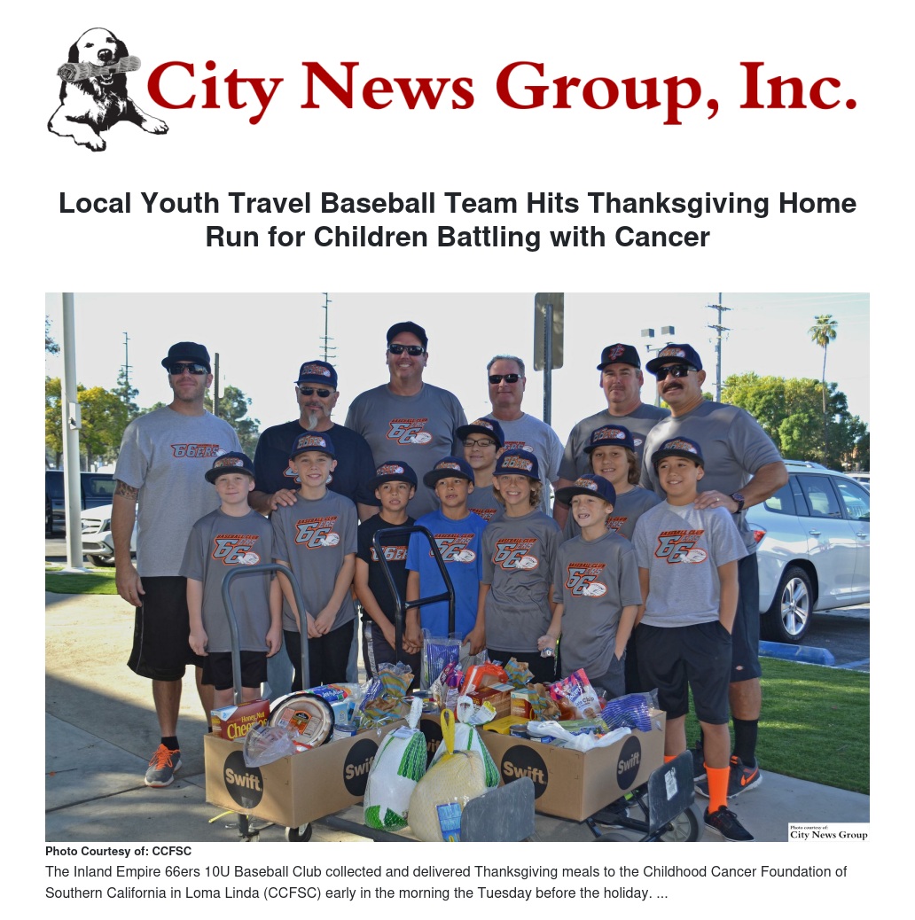 The Redlands-based Inland Empire 66ers 10U Baseball Club collected and delivered Thanksgiving meals to the Childhood Cancer Foundation of Southern California in Loma Linda (CCFSC) early Tuesday morning, Nov. 24.